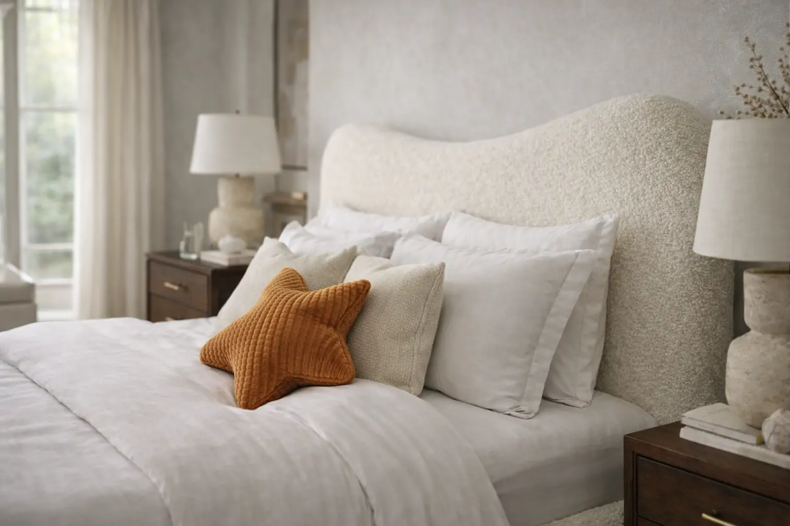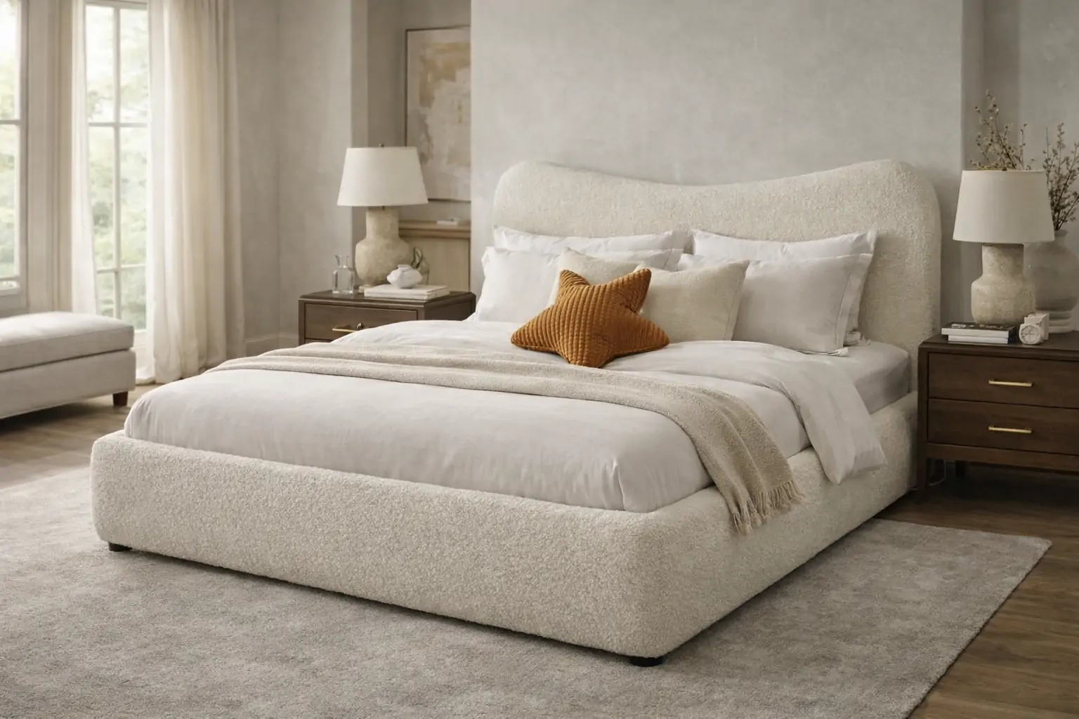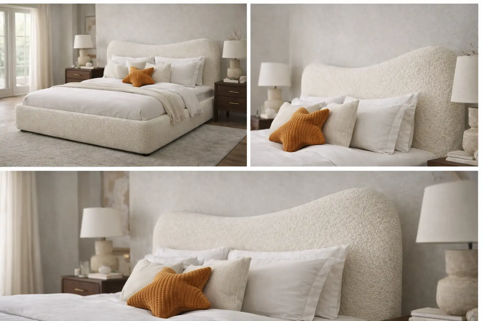 העיצוב הרך עם קווים מעוגלים והריפוד הבהיר יוצר תחושת רכות וניקיון עיצובי, בעוד ראש המיטה הגבוה מעניק נוכחות מרשימה ונוחות מושלמת להישענות.
