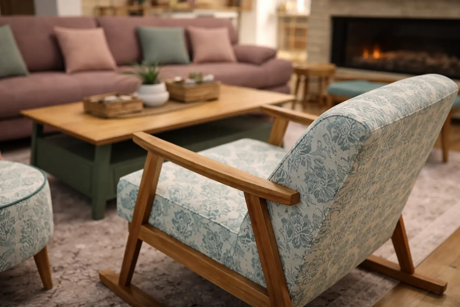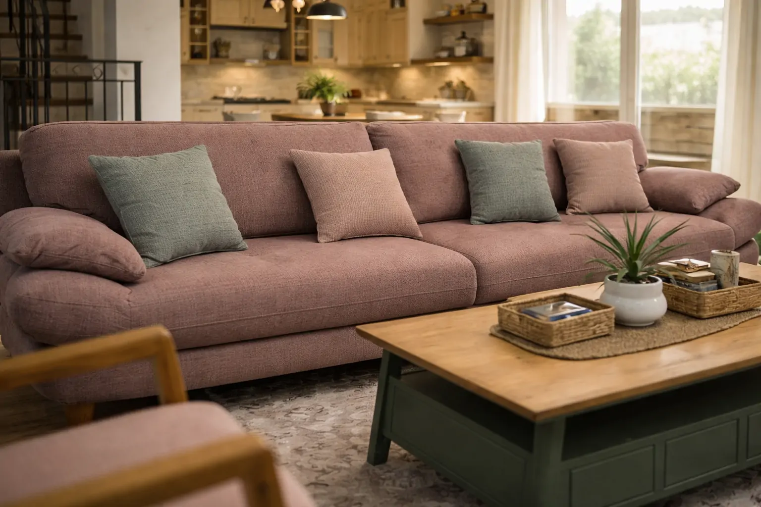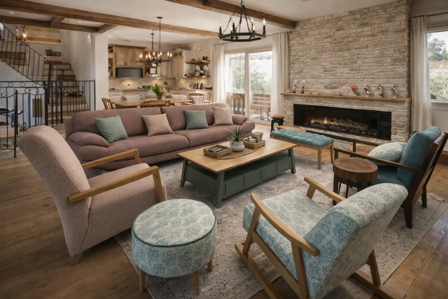 העיצוב הכפרי בשילוב בדים רכים וגוונים טבעיים יוצר סלון מלא אופי, כזה שמרגיש כמו מקום לברוח אליו מהיום-יום.