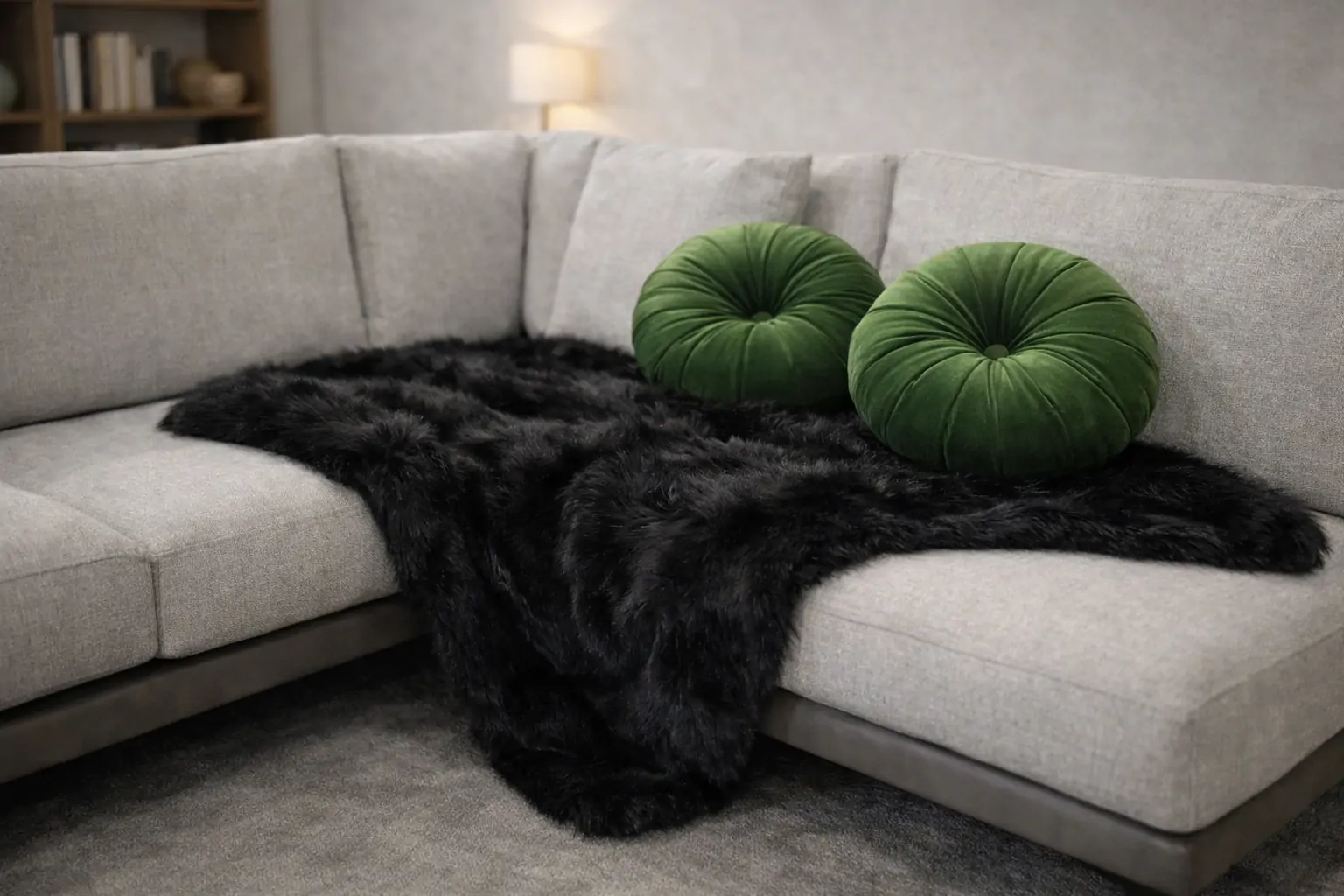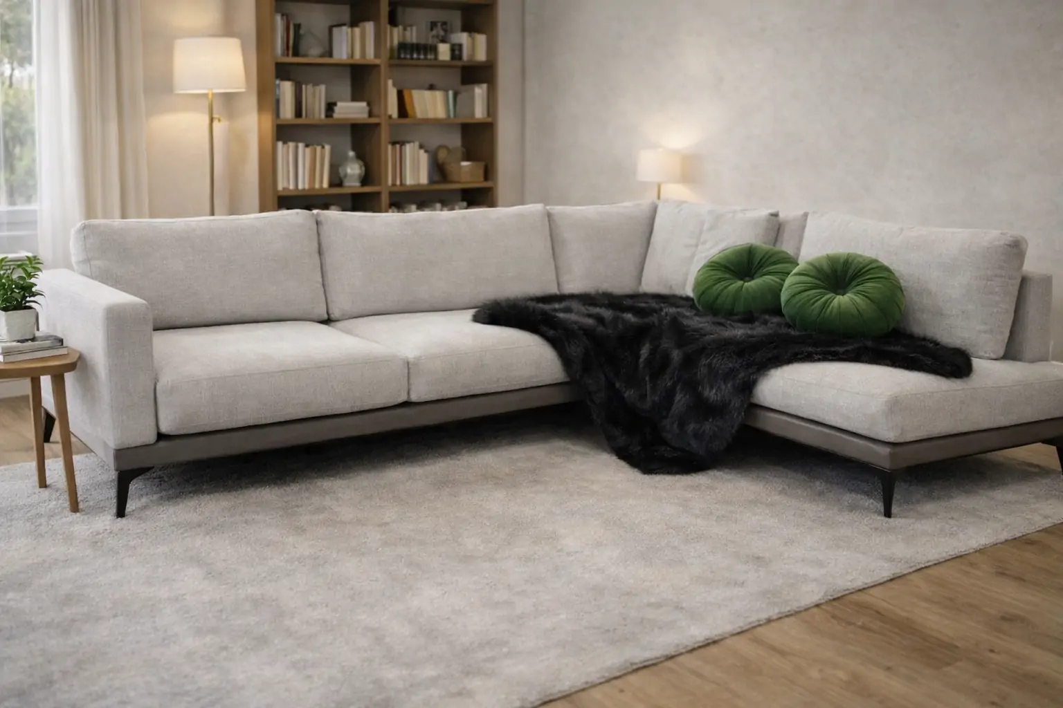 הריפוד הבהיר משתלב בצורה מושלמת עם אלמנטים כהים כמו שמיכת פרווה או כריות צבע, ומאפשר לשחק עם העיצוב בקלות. המבנה הפינתי הרחב מספק נוחות גבוהה לצד מראה מוקפד ולא כבד.