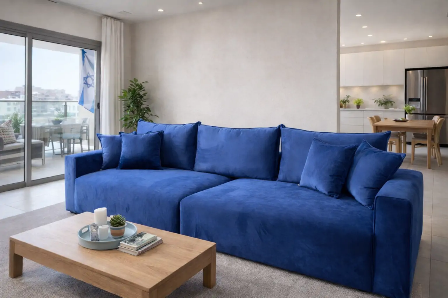 הריפוד בגוון כחול עמוק ועשיר יוצר מראה יוקרתי ובולט, כזה שתופס את העין ומרים את כל החלל.