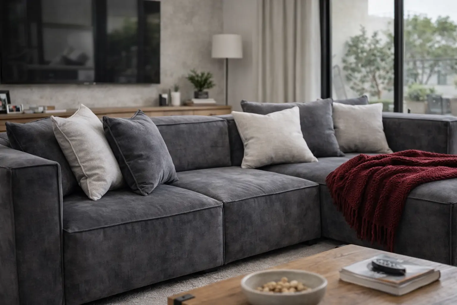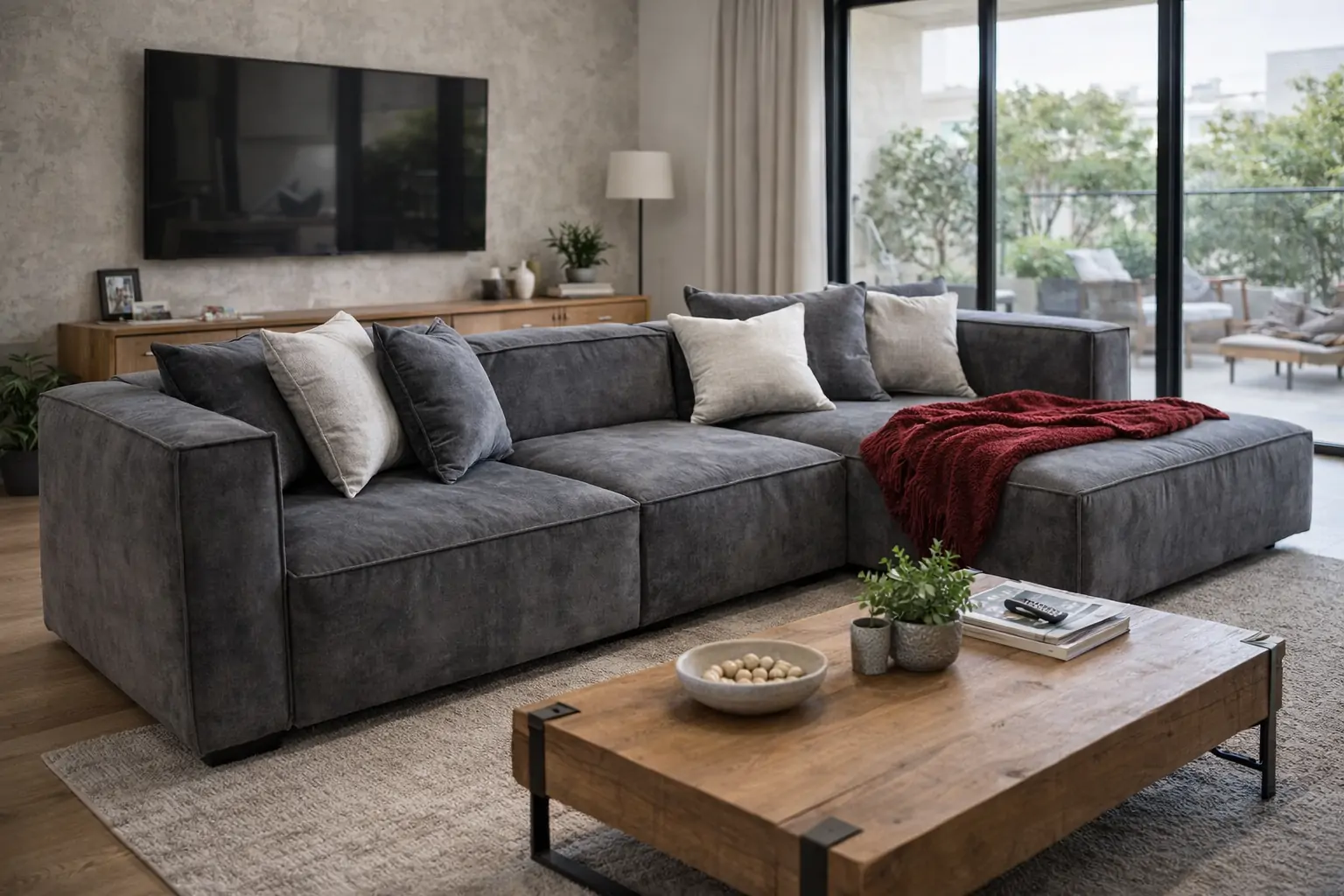 הגוון האפור-כהה מעניק לספה מראה מודרני, עמוק ויוקרתי, בעוד הכריות הבהירות מוסיפות איזון ורכות לעיצוב הכולל. המבנה הנמוך והרחב נותן תחושת “לאונג’” אמיתית.